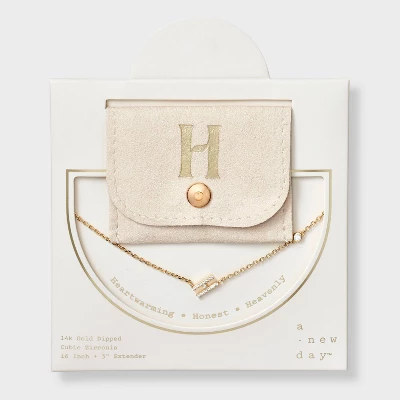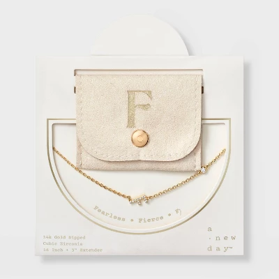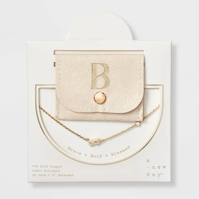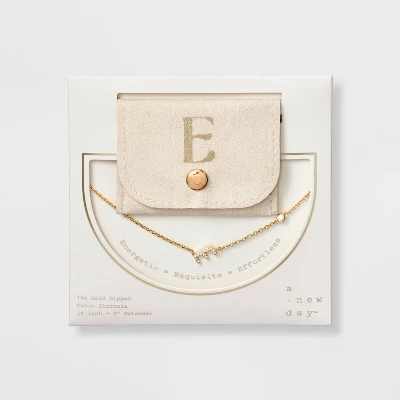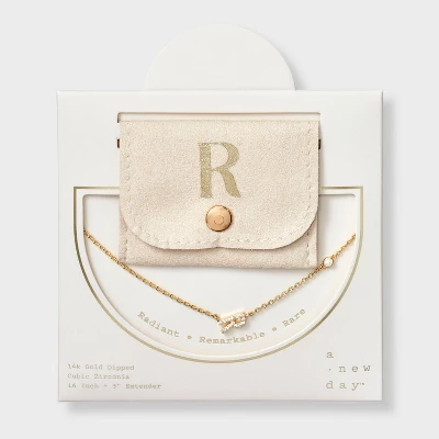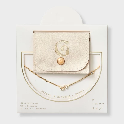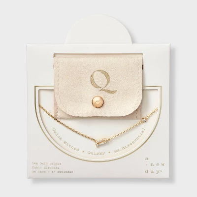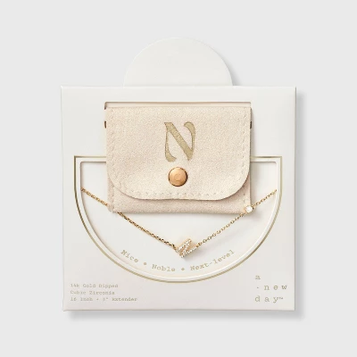 Add a touch of bling to any outfit with this 14K Gold-Dipped Cubic Zirconia Initial Necklace from A New Day™. Dipped in 14K gold, this necklace features a chain with a cubic zirconia stone and an initial charm studded with cubic zirconia for a dazzling look. Made of brass, this necklace is designed with a lobster claw clasp closure for a snug fit. Plus, it features a 16-inch chain and a 3-inch extender to adjust the length to your liking. The included gift box makes it an ideal present for your loved ones.