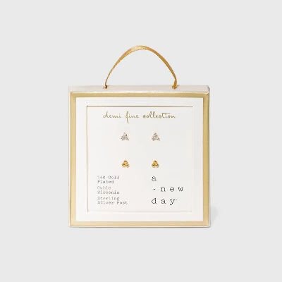 Give your favorite outfits a sparkly upgrade with the 14K Gold Plated Cubic Zirconia Ball Cluster Stud Earring Set from A New Day™. This set comes with two pairs of earrings, both with a 14k gold-plated, nickel-free metal structure. The other pair includes a cubic zirconia stone detail that adds an extra shiny charm to your style. A post-clasp closure helps keep these earrings in place as you go about your day in style.