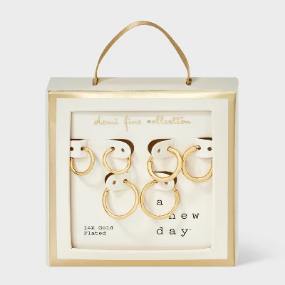 Create a simple yet elegant look everyday by accessorizing with the 14K Gold-Plated Hoop Earring Set from A New Day™. This gold-tone earring set includes three pair of simple earrings in varying sizes for accessorizing options. Made of metal, these earrings have clip-in clasp closures for a nice fit around ears. You can wear them alone or pair with matching necklace and a bracelet.