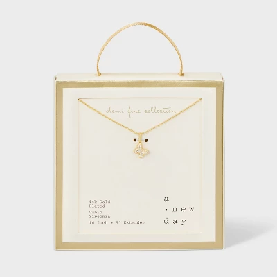 Adorn your neck with the simple yet elegant style of the Cubic Zirconia 14K Gold-Plated Pave Necklace from A New Day™. This pendant necklace features a cubic zirconia stones pendant and a chain for a beautiful look. Designed with an extender chain, this nickel-free necklace suits all skin types, and has a spring ring clasp closure for a secure fit.