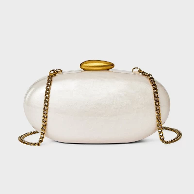Upgrade your accessory collection with this Organic Minaudiere Clutch from A New Day™. This clutch bag features an oval shape in pearl and golden hues for a standout look. It has a single main compartment to keep cards and other small items organized, and a snap closure helps keep the contents secured yet close at hand. Designed with a removable chain strap handle, it’s easy to carry with you wherever you go.