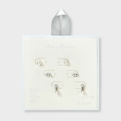 Get ready for the evening in glam style by accessorizing your ears with the pieces from the Sterling Silver Pearl Dangle Stud Earring Set from A New Day™. This silver-tone earring set includes round faux pearl, dangling stones and more with cubic zirconia accents for stylish accessorizing options. Made of nickel-free metal to suit most skin types, these earrings have postback closures for a snug fit in your ears.